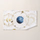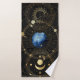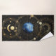 Hermosos símbolos astrológicos azules y dorados y celestiales dentro del círculo dorado y colocados sobre una imagen de terciopelo negro con copos de oro.