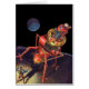 Ilustracion vintage futurista Ciencia Ficción extraterrestres y robots imagen. Un astronauta héroe se encuentra con una gran máquina de robots malvados sobre él en un planeta extranjero en el espacio exterior, una gran luna está en el cielo nocturno. Un clásico diseño de historietas retro de ciencia ficción de los años 50.