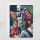 Ilustración vintage futurista de ciencia ficción de alienígenas y robots que muestra a un hombre trabajando en su robot metálico. Un astronauta es un piloto que maneja los controles de su cohete. Diseño clásico retro de ciencia ficción de los 50 al estilo de los cómics.