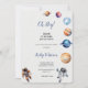 ASTRONAUTES AND PLANETS BABYSHOWER INVITATION Invitación de Baby Shower de temática espacial con astronauta para bebés de color acuático y elementos espaciales que incluyen planetas, estrellas, un cohete y OVNI. Personalice su información o haga clic en "Haga clic en el personalizar más adelante" para editar estilos de fuente, tamaño y colores.