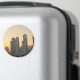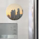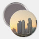 Redondo de un imán fotográfico con los rascacielos en el horizonte del centro comercial de Doha, la capital del país del Golfo Arábigo, Qatar, al atardecer.