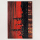 En este paisaje acuático industrial, el cielo está inundado de rojo después de una brillante puesta de sol en Portland, Maine. Los derrricks de petróleo en construcción crean siluetas duras contra los brillantes rojos y naranjas. Puntos de luz que se reflejan en el agua del océano mientras el trabajo continúa por la noche.