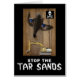 Un monte de pato con un pato mallard aceitado y muerto, equipo para mover la tierra, y un cráneo y huesos cruzados. También aparece un texto que dice "DETENGAN LAS ARENAS DE TAR". Lástima de cualquier ave acuática que desembarque en un estanque de relaves tóxicos en Alberta donde se extrae un petróleo extremadamente viscoso de las arenas de alquitrán (también conocido como arenas de petróleo) con horribles efectos ambientales. Las arenas alquitranadas de Alberta consisten en petróleo crudo pesado mezclado con arena, arcilla y betún. La extracción implica quemar gas natural para generar suficiente calor y vapor como para derretir el petróleo de la arena. Se necesitan hasta cinco barriles de agua para producir un solo barril de petróleo. Cada día millones de galones de agua están contaminados con químicos, incluyendo arsénico, cobre, plomo y zinc, para separar básicamente el aceite de arenas alquitranadas (llamado betún diluido) de la arena. Pero el agua está tan contaminada después de este proceso que tienen que almacenarla en lodos tóxicos llamados estanques de relaves. Se estima que cada día se filtran 3 millones de galones de agua contaminada desde estanques de relaves hasta el río Athabasca de Alberta, y el paisaje circundante. Por favor, di que no a las arenas alquitranadas.