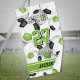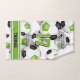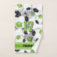 Esta toalla de mano de espíritu de equipo para un futbolista tiene un nombre de atleta fácil de personalizar y un número de camiseta más un nombre de equipo y mascota sobre la imagen de fondo de un montón de balones de fútbol verde, negro y blanco brillantes dispuestos al azar sobre un fondo blanco. Las pelotas de fútbol se sombrean selectivamente, dándoles un aspecto 3D. El nombre del atleta se puede personalizar en rayas de barniz horizontal en el borde inferior de la toalla - por katz_d_zynes