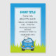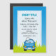 Coche personalizado azul sonriente con burbujas de jabón sobre hierba verde bajo el cielo azul.