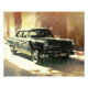 El clásico auto americano en la calle de la vieja Habana, Cuba estacionado frente a la colorida foto impresa de la construcción.