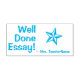 Este motivador diseño de sellos de goma muestra el mensaje positivo "¡Bien hecho Essay!" y un nombre personalizado del profesor. También tiene forma de estrella decorativa. Podría ser utilizado por un profesor o educador escolar al marcar las asignaciones, para reconocer que el estudiante ha tenido un buen desempeño.
