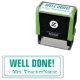 Este motivador diseño de sellos de goma incluye el mensaje "¡BIEN HECHO!" y el nombre personalizado del profesor. Podría ser utilizado por un profesor o educador al marcar las asignaciones, para reconocer que el estudiante ha tenido un buen desempeño.