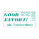 Este diseño positivo de sello de goma incluye el mensaje "¡BUEN ESFUERZO!" y el nombre de un tutor personalizado. Podría ser utilizado por un profesor, educador, instructor o tutor al marcar las asignaciones, para indicar que un estudiante ha tenido un buen desempeño.