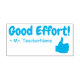 Este motivador diseño de sellos de goma incluye el inspirador mensaje "¡Buen esfuerzo!" y el nombre de un educador personalizado. También cuenta con un icono decorativo para la imagen en miniatura. Podría ser utilizado por un profesor o educador al marcar las asignaciones, para reconocer que el estudiante ha tenido un buen desempeño.