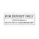 Este diseño tradicional de sellos de goma incluye el mensaje "ÚNICAMENTE PARA DEPOSITIVO", además de un nombre personal/comercial personalizado y un número de cuenta. Tal vez podría ser utilizado por un empleado de oficina, un operador de una pequeña empresa o un individuo para agregar rápidamente un indicio restrictivo a un cheque.