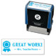Este positivo diseño de sellos de goma incluye el inspirador mensaje "¡GRAN TRABAJO!" y el nombre de un educador personalizado. También incluye un icono decorativo de la cinta de premio. Podría ser utilizado por un profesor o educador al calificar el trabajo estudiantil, para reconocer que un estudiante ha hecho un trabajo excepcional.
