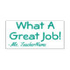 Este positivo diseño de sello de goma incluye el inspirador mensaje "¡Qué gran trabajo!" y el nombre de un educador personalizado. Podría ser utilizado por un profesor o educador al marcar las asignaciones, para reconocer que el estudiante ha tenido un buen desempeño.