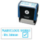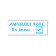 Este diseño positivo de sello de goma incluye el motivador mensaje "¡TRABAJO MARVELOUS!" y un nombre personalizado del profesor. También cuenta con una marca de verificación decorativa. Podría ser utilizado por un profesor o educador al calificar el trabajo estudiantil, para reconocer que un estudiante ha hecho un trabajo excepcional.