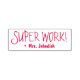 Este positivo diseño de sellos de goma muestra el motivador mensaje "¡SUPER TRABAJO!" y el nombre de un profesor personalizado. Podría ser utilizado por un profesor o educador al marcar las asignaciones, para reconocer que un estudiante ha tenido un buen desempeño.