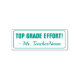 Este divertido diseño de sellos de goma incluye el mensaje de elogio "TOP GRADE EFFORT!" y el nombre de un educador personalizado. Podría ser utilizado por un profesor de escuela, educador o tutor al marcar las asignaciones, para indicar que un estudiante ha tenido un buen desempeño.