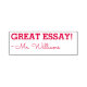 Este positivo diseño de sello de goma incluye el mensaje "¡GRAN ESSAY!" y el nombre de un educador personalizado. Podría ser utilizado por un profesor o educador al marcar las asignaciones, para reconocer que el estudiante ha hecho un gran trabajo.