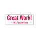 Este positivo diseño de sello de goma incluye el mensaje "¡Gran trabajo!" y el nombre de un tutor personalizado. Podría ser utilizado por un profesor, educador o tutor al marcar asignaciones, para reconocer que el estudiante ha hecho un gran trabajo.