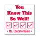 Este motivador diseño de sellos de goma incluye el motivador mensaje "¡Sabes esto tan bien!" y el nombre de un educador personalizado. También cuenta con una marca de verificación decorativa. Podría ser utilizado por un profesor o educador al marcar las asignaciones, para reconocer que un estudiante ha tenido un buen desempeño.