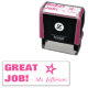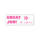 Este divertido diseño de sello de goma incluye el mensaje "¡GRAN TRABAJO!" y el nombre personalizado del profesor. También tiene forma de estrella decorativa. Podría ser utilizado por un profesor o educador al marcar las asignaciones, para reconocer que el estudiante ha tenido un buen desempeño.