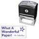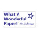 Este motivador diseño de sellos de caucho muestra el motivador mensaje "¡Qué papel maravilloso!" y el nombre de un profesor personalizado. También tiene forma decorativa de contorno estelar. Podría ser utilizado por un profesor, educador, instructor o tutor al marcar las asignaciones, para reconocer que un estudiante ha tenido un buen desempeño.