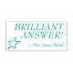 Este diseño de sello de goma positivo presenta el mensaje inspirador "¡RESPUESTA BRILLANTE!" y el nombre personalizado del profesor. También cuenta con una forma de estrella decorativa. Podría ser utilizado por un profesor o educador al calificar el trabajo del estudiante, para reconocer que un estudiante ha hecho un trabajo excepcional.