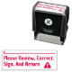 Este humilde diseño de sellos de goma incluye el mensaje "Por favor revise, corrija, Rótulo y devuelva", más una línea que una firma o iniciales podrían ser escritas arriba. Tal vez podría ser utilizado por un profesor o un profesional administrativo para solicitar que alguien revise y reconozca el contenido de un documento o de algún otro papeleo.