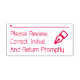 Este respetable diseño de sellos de goma incluye el mensaje "Revise, Correcto, Inicial y Regrese sin demora", junto con una línea donde se puede escribir una firma o iniciales arriba. Tal vez podría ser utilizado por un educador o un profesional administrativo para solicitar que alguien revise y reconozca el contenido de un documento.