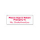 Este diseño de sello de goma corporativa incluye el mensaje "Por favor, Rótulo y devuélvelo rápidamente a", y una línea que puede ser escrita anteriormente con una firma o iniciales. También incluye un educador personalizado o un nombre de tutor. Tal vez podría ser utilizado por un profesor, tutor o educador para pedirle a los padres o tutores de un estudiante que revisen y reconozcan la nota que un estudiante obtuvo en un proyecto, un examen, un ensayo, un periódico o algún otro trabajo escolar.