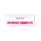 Este diseño de sello de goma incluye el mensaje "PAYMENT COMPLETE" y una línea donde se puede escribir una fecha de pago. Podría utilizarse para marcar una factura o factura como pagada.