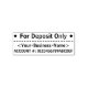 Este sencillo diseño de sello de goma incluye el mensaje "Sólo para depósito", más un nombre de personalizable y número de cuenta. Tal vez podría ser utilizado por un operador de pequeñas empresas, un particular o un empleado de oficina para agregar de manera eficiente un respaldo restrictivo a un cheque.