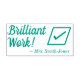 Este motivador diseño de sellos de caucho muestra el mensaje positivo "Brilliant Work!" y el nombre personalizado del profesor. También cuenta con una marca de verificación decorativa. Podría ser utilizado por un profesor o educador escolar al marcar las asignaciones, para reconocer que el estudiante ha hecho un gran trabajo.