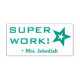 Este motivante diseño de sellos de goma incluye el motivador mensaje "¡SUPER TRABAJO!" y un nombre personalizado del profesor. También tiene forma decorativa de contorno estelar. Podría ser utilizado por un profesor o educador al marcar las asignaciones, para reconocer que el estudiante ha hecho un gran trabajo.