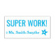 Este positivo diseño de sello de goma muestra el mensaje positivo "¡SUPER TRABAJO!" y el nombre de un educador personalizado. También tiene forma decorativa de contorno estelar. Podría ser utilizado por un profesor o educador al marcar las asignaciones, para reconocer que el estudiante ha hecho un gran trabajo.