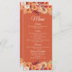 Menú Floral de otoño. Flores pintadas a acuarela en los colores otoñales del naranja, el rubor, el amarillo, el rojo y el rosa, con acentos de Relieve metalizado dorado, todo ello en un marco naranja. Ideal para bodas clásicas, contemporáneas y vintage en otoño. Examine la selección de invitaciones coordinadas, tarjetas RSVP, signos y más.