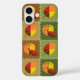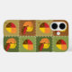 Cuatro cuadrados están decorados con hojas y calabazas en tonos caídos de rojo, naranja, amarillo y marrón. El punzonado blanco aporta un toque decorativo, dando a este patrón la apariencia de un edredón, creando un ambiente muy acogedor para el otoño.