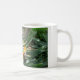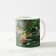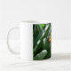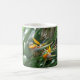 Taza de café mostrada con una impresión de la foto de la ave del paraíso tropical de la flor.