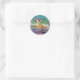 Pegatina de Navidad con un pájaro acuático usando un sombrero rojo de Santa, y caminando en una playa tropical y de arena.