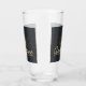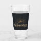 Vidrio que bebe con un ilustracion de color dorado sobre un fondo gris negro. Diseñado con un ilustracion de montaña con los rayos de sol brillando hacia afuera desde atrás. La tipografía dice: "Aventura explorar el descubrimiento de los sueños".