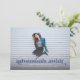 Esta invitación de graduación de fotos de sangre completa y la invitación incluye las palabras "aventuras a la espera" en azul. Tiene espacio para los detalles de tu graduado en la parte delantera con aún más espacio para texto en la parte posterior de la tarjeta.
