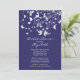 Empiece con su ducha nupcial con nuestras modernas invitaciones a la ducha de novias azul marino y blanco. Nuestra invitación a la moda y a la elegante ducha nupcial incluye un par de aves amorosas con una rama floral de árbol adornada con corazones y mariposas. Una invitación perfecta para una ducha nupcial al aire libre o en el jardín. Solo personalizar nuestra invitación con la información de tu boda y estás listo para ir. Disponible en otras combinaciones de colores en nuestra tienda en www.celebrateitweddings.com. Consulte nuestras notas de agradecimiento, pegatinas y botones de novia en nuestra tienda