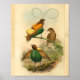 ilustracion de Aves del Paraíso de 1876. Con plumas amarillas, verdes, naranjas y marrones sentados en una rama de árbol.