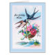 Un par de golondrinas en vuelo, llevando una cesta de flores en sus picos. La inscripción dice los mejores deseos de cumpleaños.