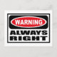 Aviso SIEMPRE A LA POSTURA DERECHA puedes personalizar en www.WarningSignShirts.com y presenta una señal de advertencia roja y negra y SIEMPRE A LA DERECHA en negrita para advertir al mundo. También puede personalizar su propia tarjeta postal con el texto que desee.
