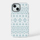 Un diseño de estilo azteca en un patrón digital y vectorial con detalles de color azul de huevo de pato sobre un fondo blanco.