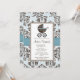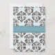 Invitaciones azules y marrones bonitas de la fiesta de bienvenida al bebé del damasco con un diseño de la cinta de la puntada del contraste y un carro de bebé del marrón oscuro con el borde azul. Ilustraciones y © Chrissy H. Studios, LLC del diseño. Todos los derechos reservados.
