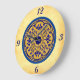 Un reloj de pared decorativo con un diseño de época azul con números azules sobre un fondo falso de pergamino. Haga clic en Personalizar para agregar su nombre o mensaje, cambiar los colores de fondo e incluso guardar el diseño para más adelante.