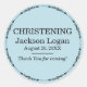 Un bonito fondo azul pálido suave está rodeado por un borde negro inspirado en el arte folclórico. La cristiandad está escrita en letras mayúsculas en negrita. El nombre del niño está escrito en letras mayúsculas y fundas menores, así como su fecha de bautizo.