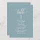 Ayude a sus huéspedes a encontrar su mesa con estas elegantes y modernas tarjetas con nombres de invitados. Tarjetas de doble cara para que los huéspedes puedan ver sus nombres desde ambos lados, delante o detrás. Espacio despejado alrededor que le da la libertad de usar clips o agujeros para las pantallas colgantes, o usar soporte de mesa/marco. Fondo azul en polvo y texto blanco. Detalles modernos de caligrafía escrita a mano. Varias opciones de color. Tener todos los números de tabla en el mismo color o mezclar colores según el tema de color del evento.
