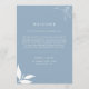 ¡Abraza a tus invitados con calidez y estilo con la "Tarjeta de bienvenida y cronograma con ramas y hojas minimalistas en azul polvoriento" de Visual Studio en Zazzle! Esta tarjeta sofisticada presenta un lienzo azul polvoriento calmante adornado con ramas y hojas blancas minimalistas, estableciendo el tono para una celebración memorable.